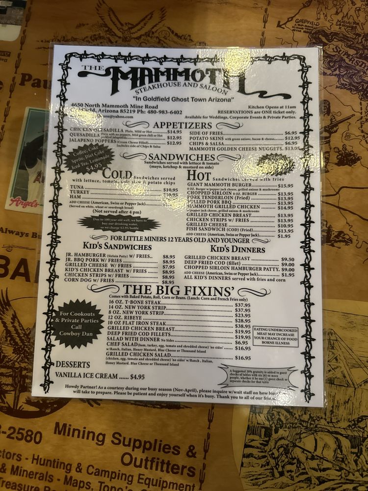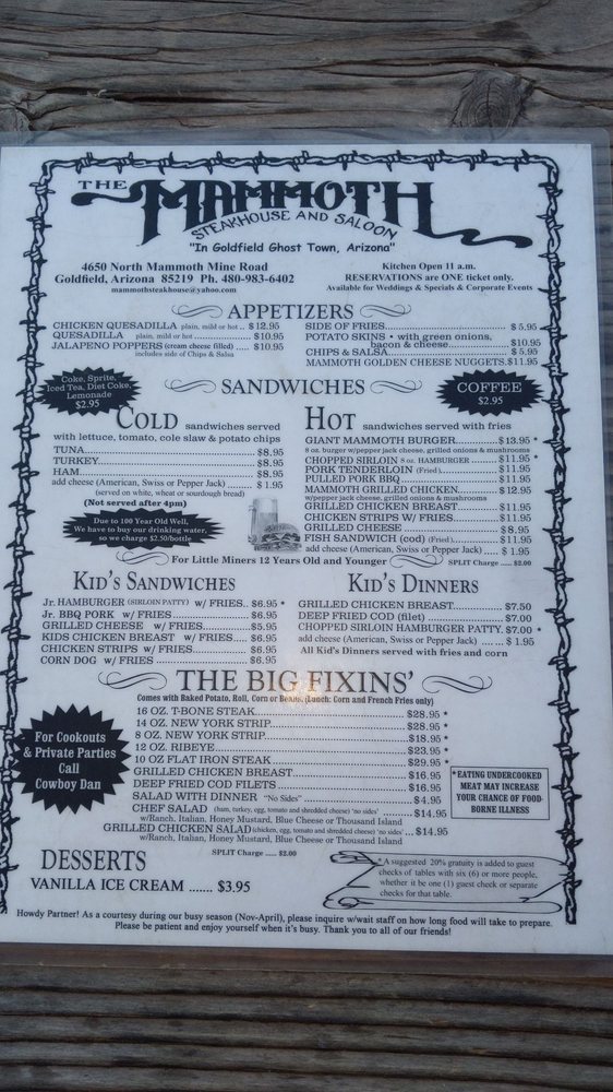 Welcome to The Mammoth Steak House, where a rustic frontier meets culinary excellence in Apache Junction, AZ. This charming establishment offers a vibrant dining experience that's perfect for families and groups, and it also caters to those seeking the authentic cowboy atmosphere. The highlight of the menu is undoubtedly the steaks; food reviewers rave about the 16oz T-Bone, which has outperformed higher-priced cuts elsewhere, delivering on taste and quality.